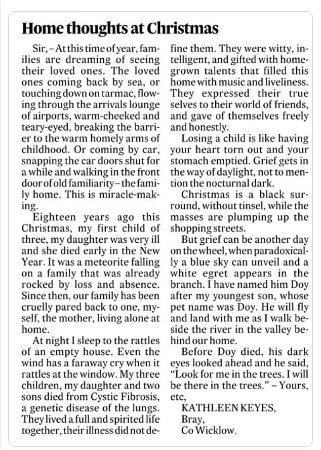 I will leave you with this deeply poignant letter, written by Mrs Kathleen Keyes of Bray in the county of Wicklow and published in the Irish Times a few days before Christmas in 2019. The letter reminds us that we are not all so fortunate as to be surrounded at this time of year by those dearest to us. It never fails to move me. If you are among those spending Christmas alone, you are in my thoughts.